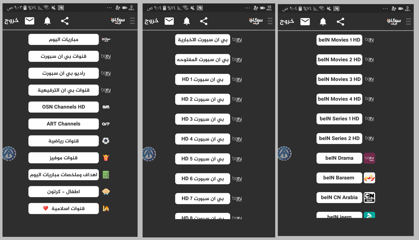 وبعد نجاحك في تثبيت التطبيق فهو بصيغة APK تجد الأيقونة الخاصة به على شاشة هاتفك الذكي أنقر عليها حيث يفتح التطبيق على تصنيفات القنوات مرتبة بشكل جميل في البداية القائمة نجد مباريات اليوم الأمس وغداً فية مواعيد المباريات وملخصاتها ونتتقل الى قنوات البن سبورت التي هي بثلاث جودات SD , HD, LOW لتتمكن من أن تشاهد القنوات على النت الضعيف وبعدها تأتي قائمة قنوات البن سبورت الرياضية الترفيهية التي تجد فيها قنوات البن سبورت ماكس لمشاهدة الأفلام الأجنبية مع الترجمة وكذلك باقات ONS بجميع أنواعها وبجودات عالية .