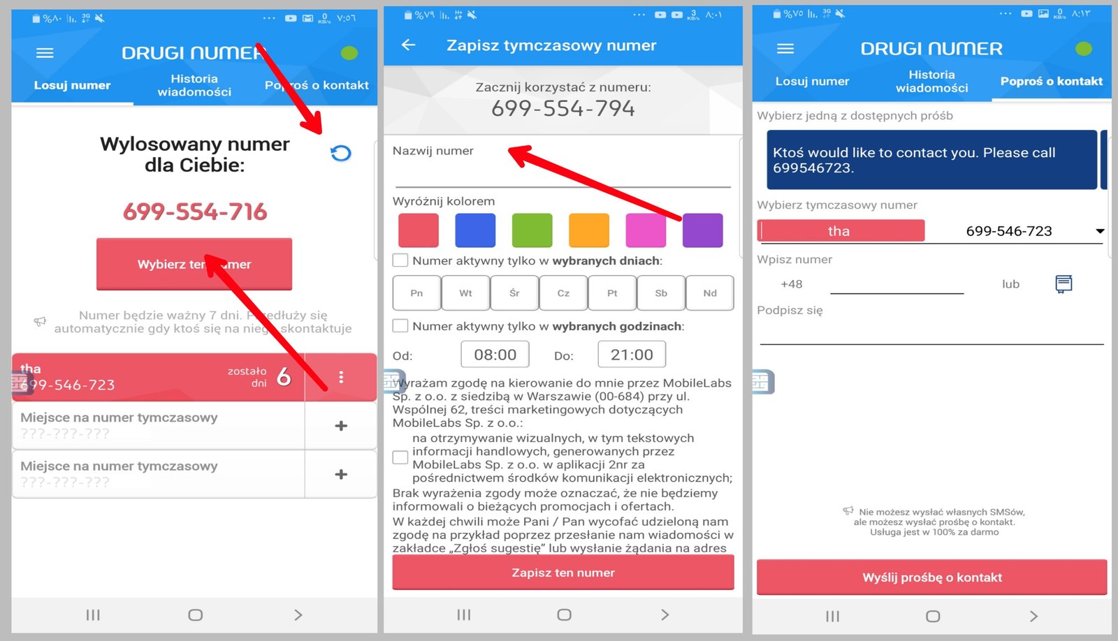 هذة المميزات يقدمها تطبيق 2nr المجاني حملة من الرابط أسفل المقال وبعد التثبيت عليك بفتح التطبيق ، مباشرة سوف تجد الرقم أمامك وأن لم يعجبك أنقر على أيقونة التحديث لتغير الرقم حسب ذوقك بدون أن تسجل في التطبيق الرقم هو بولندي يحمل مفتاح +48 التطبيق يقدم الخدمة مجاناً ، حيث ستحصل على ثلاثة أرقام مؤقتة لمدة 6 أيام وتستطيع تمديد صلاحية كل خط بعد أنتهاء الصلاحية ، عند النقر على Wybierz ten numer داخل المربع الأحمر.