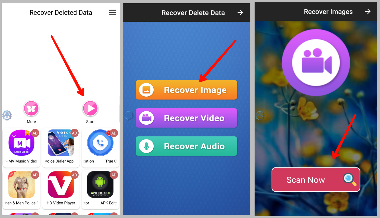 ولايمكن أن تعيد أكثر من ذلك ، فما هو مصير مقاطع الفيديو وقد تكون هنالك تسجيلات صوتية وهل يمكن أسترجعها ؟ وللجواب على الكثير من الأسئلة حول وجود تطبيق لأستعادة ما ذكرناة أعلاه ، نعم يوجد تطبيق لم يعلم بة أحد فهو خطير يطلق علية Recover Deleted Data يعتمد على ملفات الداتا ليرجع كل ما تم حذفة من صور وفيديو وتسجيلات