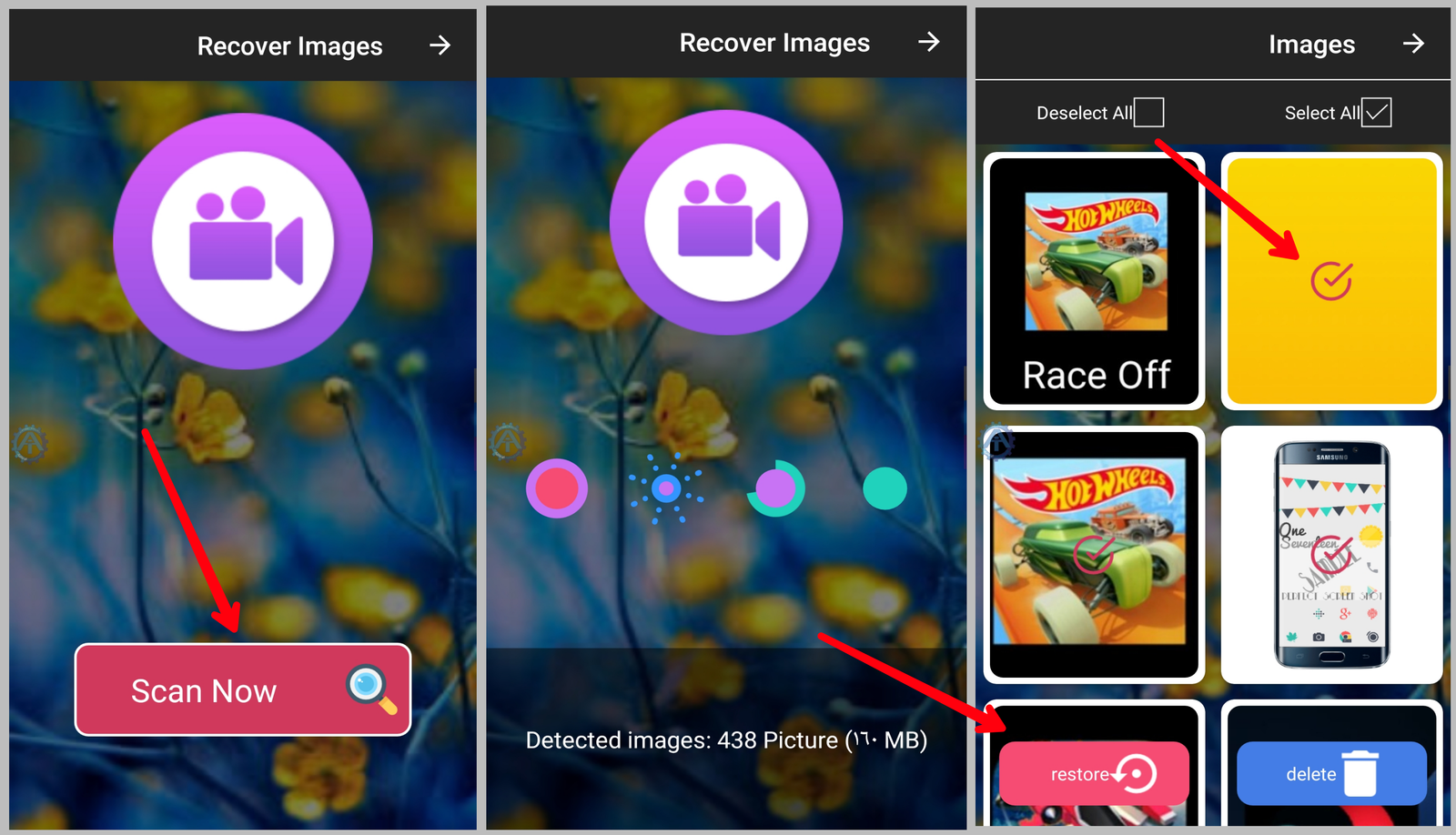 حيث تشمل قسم أسترجاع الصور Recover Image تحددة وتفتح صفحة جديدة في نهاية الشاشة تجد مربع فية كلمة Scan Now أنقر عليها للبحث عن الصور وبعدها تظغط على Show Pictures وبثواني تظهر كل المجلدات الموجودة في هاتفك التي تحتوي على ألاف الصور حدد التي تريد أستعادة من الصور وختر restore للأستعادة أو delete للحذف ونلاحظ وجود الصور التي حددناها في الأستديو.