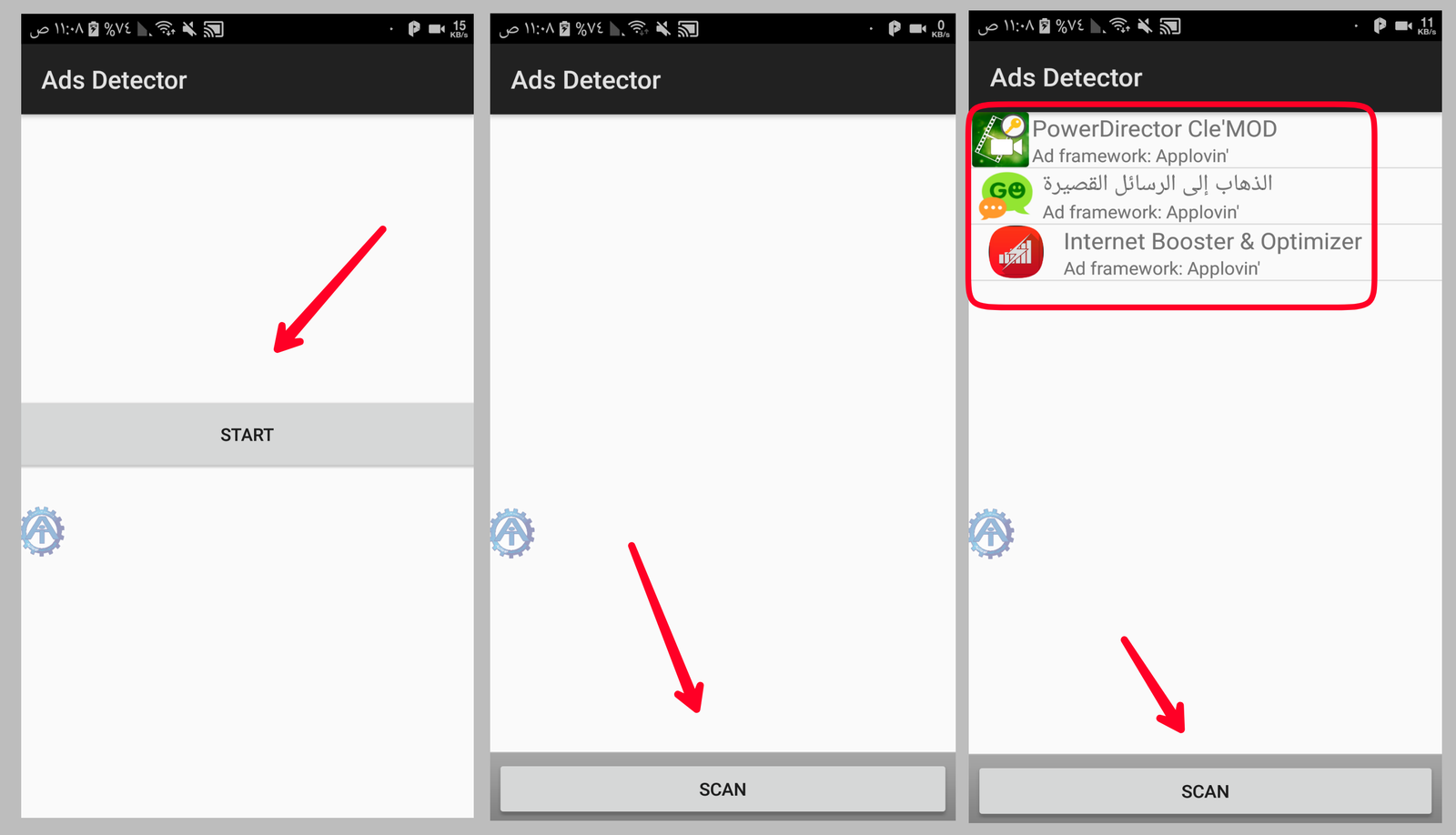 عند فتح التطبيق تنقر على START تضغط عليها وتنتقل الى واجهة ثانية على نفس التطبيق أسفل الشاشة تجد كلمة SCAN بعد النقر عليها يعمل التطبيق على البحث عن التطبيقات التي فيها أعلانات منبثقة ، وألغي تثبيتها أو وقف أشعات التطبيق من الضبط ومن ثم التطبيقات وأختار التطبيق وأنقر على السماح بالأشعارات وجعلها أيقاف.