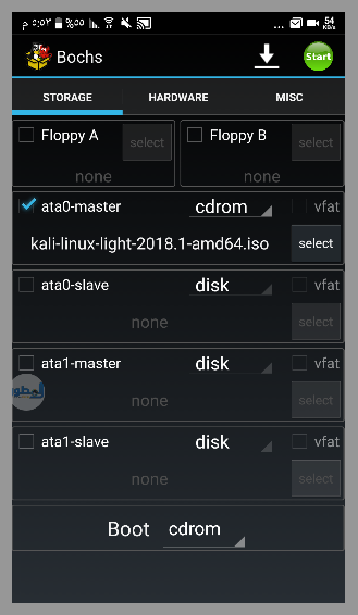 توجد طرق كثيرة لتثبيت نظام Kali Linux على هاتف الأندرويد،  لأختبار عمليات الأختراق، ومن هذة التطبيقات تطبيق يدعى Bochs  روابط التحميل أسفل المقال وهو عبارة عن أداة أو محاكي لتشغيل نظام كالي لنكس على الهاتف ، يجب عليك تحميل ملف الكالي لنكس بصيغة أيزو من الموقع الرسمي من هنا ، وأنسخة الى الذاكرة الداخلية للهاتف وكما في الصورة .